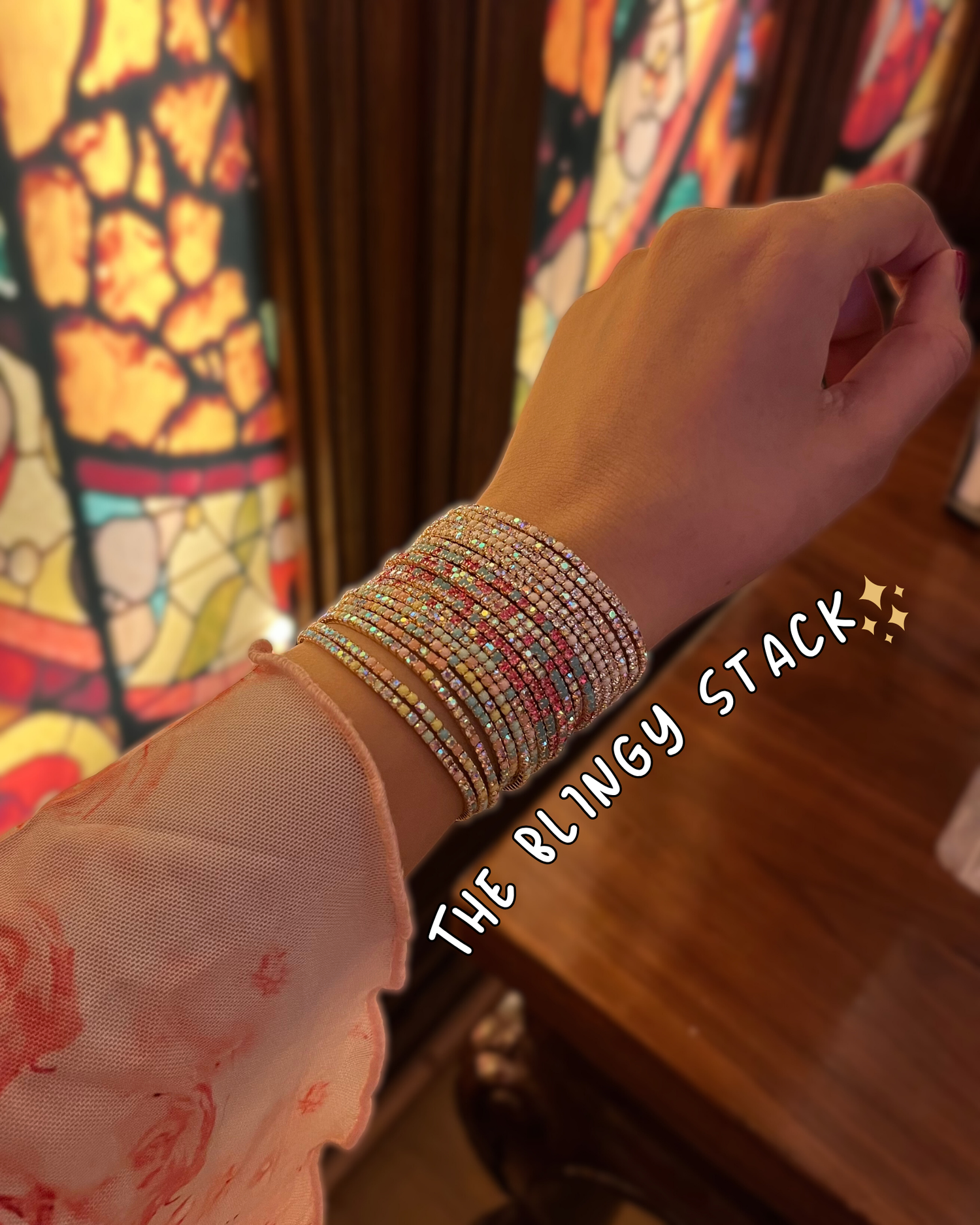 Turn every glance into a double-take with The Blingy Stack – a dazzling medley of sleek, shimmering stacks crafted to make your wrist the star of the show. Designed for those who believe more sparkle is always better, this statement stack brings together vibrant colors and radiant shine in perfect harmony.
